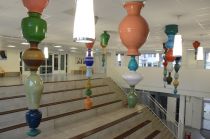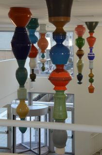 For the Roemer Visscher College in The Hague South West the artist André Pielage created the work ‘Aardewerk' (literal translation: 'pottery' or 'earthenware'). Like stalactites dozens of colourful vases and jars (from a great variety of cultures) hang from the high ceiling of the white entrance hall of the school.