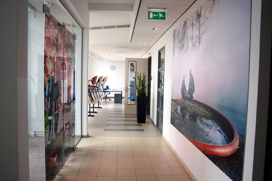 Barbara Smeenk was commissioned to create a work of art for the new building of the fire brigade in Leidschenveen. She made a transparant photo measuring 188 cm x 232 cm in the glass entrance door and directly behind it on the wall (at a distance of 2 meters) she added another photo measuring 200 x 300 cm. When entering the building the second photo is visible through the first photo in the glass door.