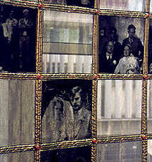 The transparent screen of silver colored material contains 72 silk-screened wedding photographs; on the edge in 17 languages the text ‘I do', ‘to wed is to love, to love is to wed'; rennaissance fabric have since been added.