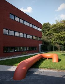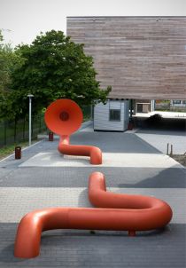 For the Maris College Bohemen the artists/designers Bisscheroux & Voet designed a monumental school bell, called the 'Woofah'. Like huge earthworms three enormous orange tubes crawl along the school yard and are transformed into a huge horn. Everytime the school bell rings, the horn produces a different sound. Bisscheroux & Voet developed around 50 alternative sounds, taken from archive material, film clips and other sources. In addition, the 'Woofah' also functions as a hangout and meeting place for the children of the school.