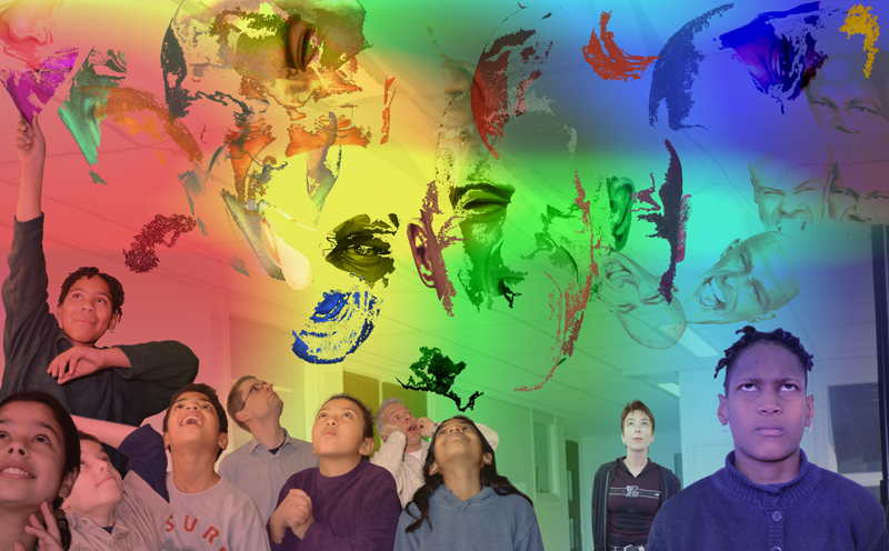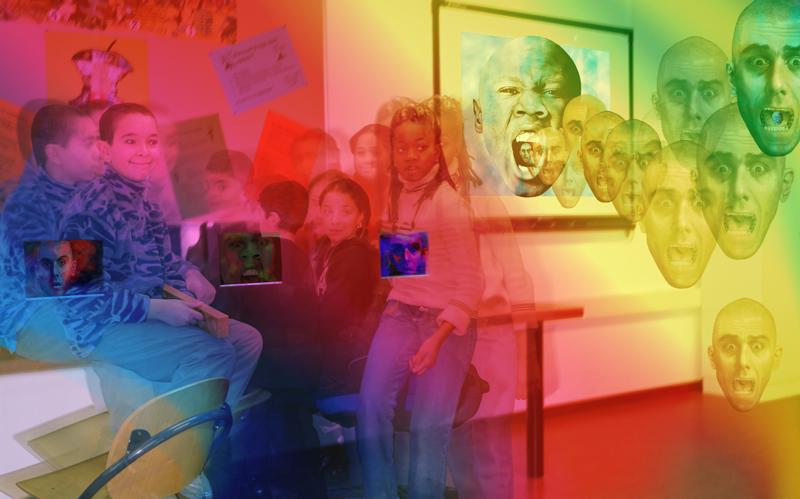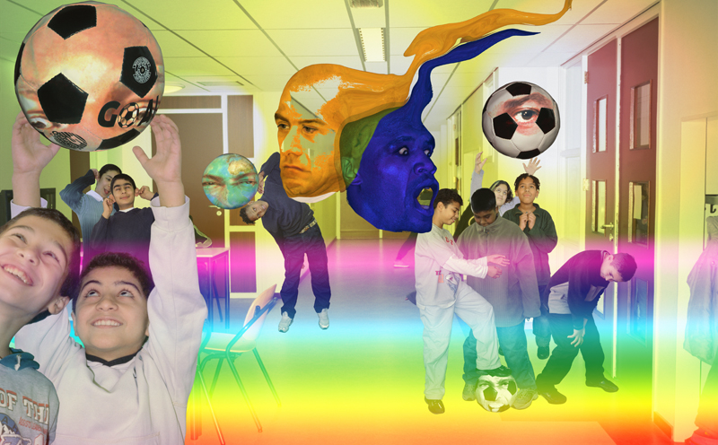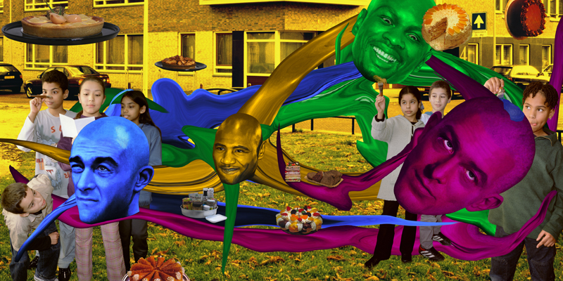 Inspired by the visual language of film and the way publicity is handled through movie posters and film stills, Elise Tak (who lives and works in New York) composes her own film stories. The main roles in these fictional “films” are played by imaginary actors entirely created by Tak on a computer. For the new branch of primary school 't Palet in the Schilderswijk neighborhood, she created several scenes from the film story The Head Head, where teachers and students appear alongside two of Tak’s own actors: Marvin Dunbar and Charlie Pep. The works are characterized by surreal images and striking use of color, aligning perfectly with the school's motto: "colorful and versatile."