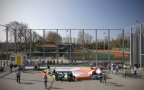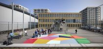 Like a flattened, multicolored diamond, artist George Korsmit designed a stage at the entrance for Maris College Houtrust. The stage is in keeping with the school's musical tradition and is an ideal place to hang out and chill.