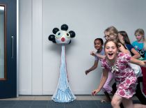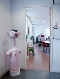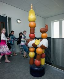 De Gantel and the Maria Montessorischool occupy one building in Wateringseveld (a suburb of The Hague). The artist Hans van Bentem had already been commissioned to design a fountain for the square in front of the school building, and consequently was also invited to create a new work of art for the schools themselves. Van Bentem wanted to use the moulds he made for the fountain as roof sculptures. In the end, however, he chose to use seven existing sculptures instead. These fashion victims had been on tour of a number of museums and galleries and were in need of a permanent location. The sculptures have been placed at various locations in the schools, with lots of children running around.