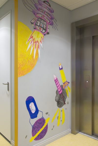 In short workshops with Het Harde Potlood, pupils of De Elout depicted their heroes and heroines on paper. These drawn heroes populate the wall drawings. They form, for example, the passengers of a rocket, or man a truck or submarine. The vehicles full of heroes sail, fly and drive through a world full of rocks, water, planets and clouds. Here and there, strange crops and creatures linger.