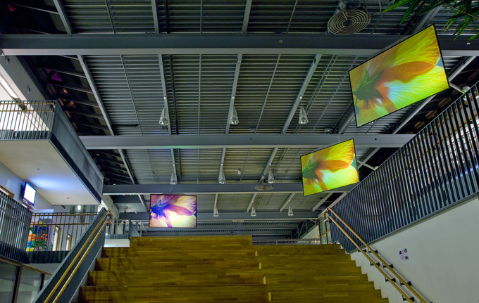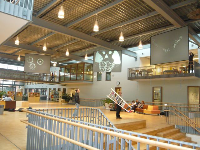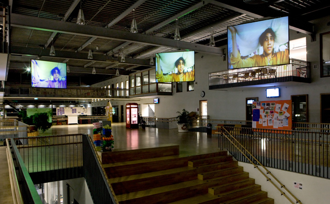 An internal TV studio/channel was created for the International School, run by students in collaboration with artists and teachers, under the guidance of Stroom. ISH TV can be seen as an audiovisual platform for creative expressions from both artists and students; all age groups within the school can participate in creating and viewing the programs. In the Plaza, the central hall of the school building, three movable screens have been installed to project broadcasts.