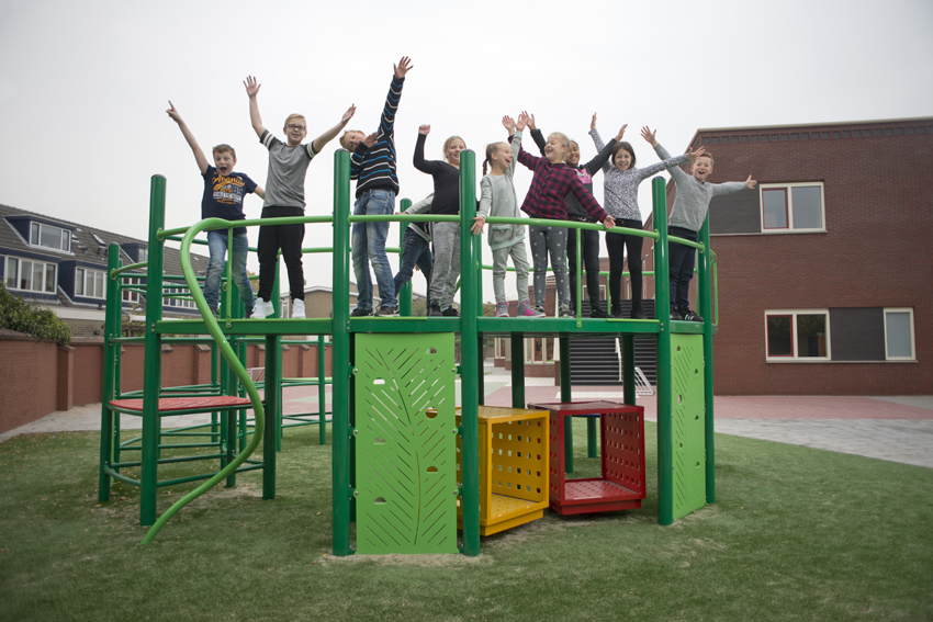 Space for an art commission is not always easy. Inside the building, coat racks, fire hoses and lamps shrink the available space to a fraction of what it looks like on drawings. And even the outdoor space is often already packed with playground equipment and street furniture. Among the students at the Rev. W.E. den Hertog School, there was a deep desire for a new climbing apparatus long before the new building was completed. Money was even raised for this through a marathon. For the art commission, the school wanted something in which the students could expend their energy.