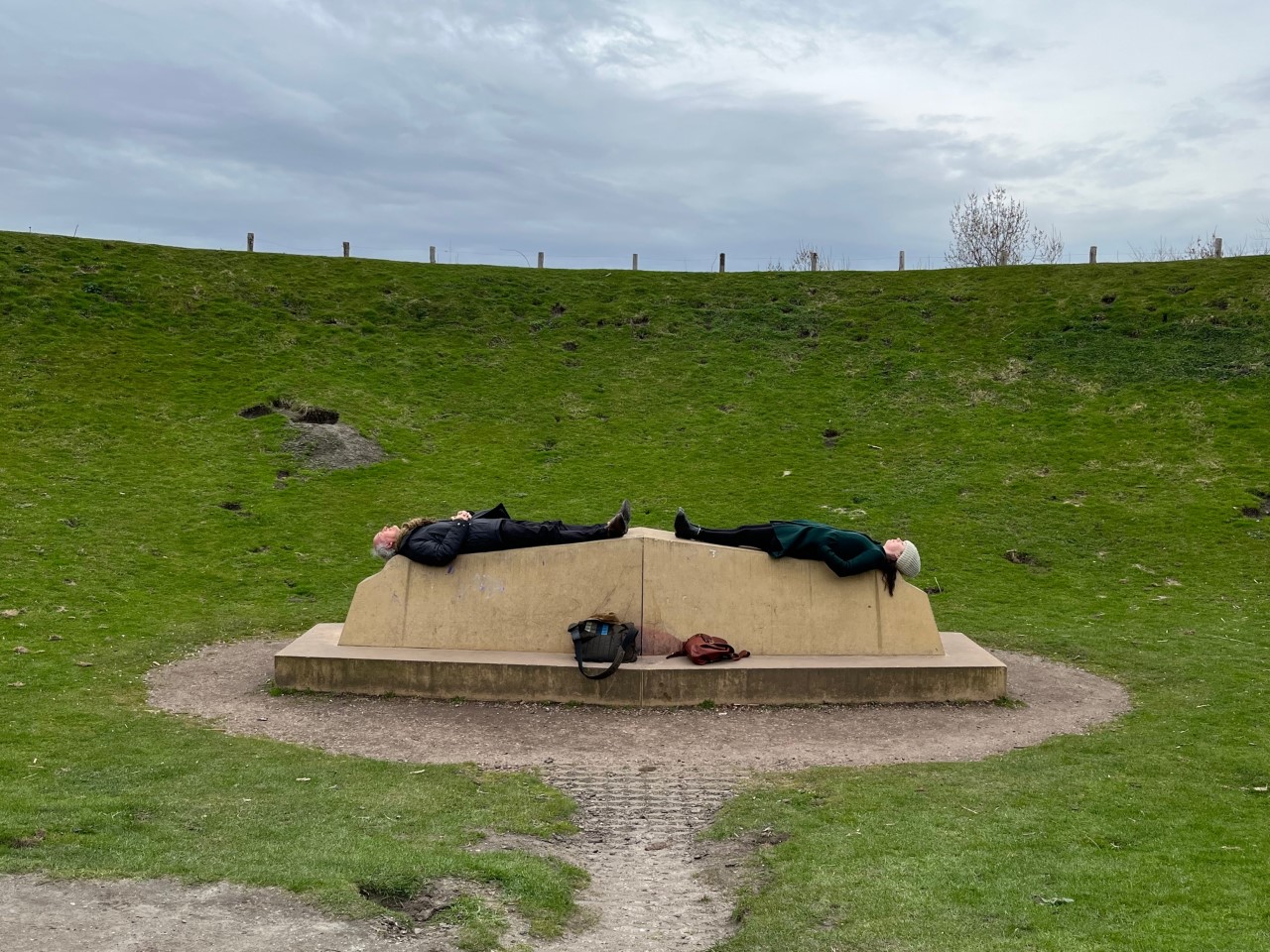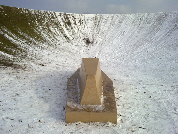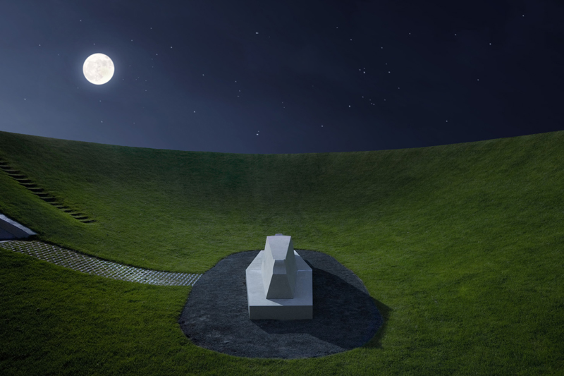 In the dunes of The Hague, where light can have such a tangible presence, Turrell created a place to gaze at the sky: ‘Celestial Vault' in Kijkduin. At the top of one of the rubble dunes, a bowl in the shape of an ellipse has been built, 30 meters wide and 40 meters long. A wall of earth, approximately 5 meters high encloses the bowl. In order to reach this artificial crater you first climb up the dune on wooden stairs and then walk through a six meter long concrete passageway. The slopes on the inside of the crater have been sown with grass and a monumental natural stone bench is in the middle on which two people can lie back and observe how the sky is a vault. A similar bench is located on a higher dune where a panorama unfolds over the sea, the beach and the flat countryside beyond. In the direction of the horizon, the vault gradually becomes flatter. For Turrell, light and space themselves are the object and one of the points he wants to make is that, during the act of observation, the observer should experience that he/she is observing.