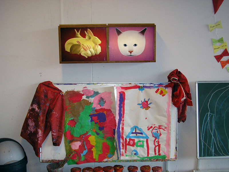 The paintings and screenprints of Rotterdam artist Jeroen Allart are so crystal clear and simple in presentation that they sometimes resemble pictograms. For this project, he devised a setup in which a large number of his images (photos, paintings, and drawings) can be displayed in a rotating "exhibition" within the school building. Together with fellow artist Frank de Bruijn, he designed a lightbox made of wood. Each classroom at Paschalisschool was equipped with such a lightbox, which can hold two slides. Allart then provided the school with a stock of ninety lightbox slides, stored in a special cabinet in the media center, from which students and teachers can draw to fill the lightboxes in the classroom. This allows the images to be adapted to what is being covered in class or what is currently of interest to the students.