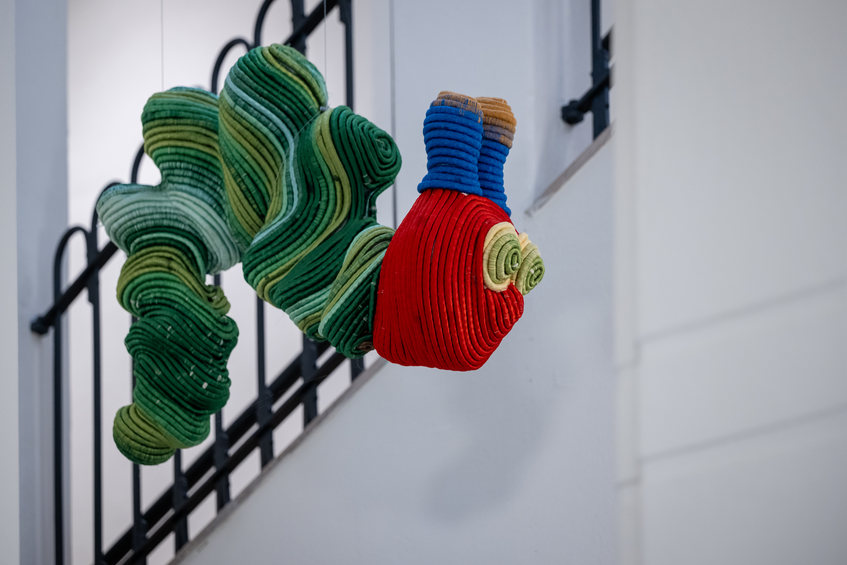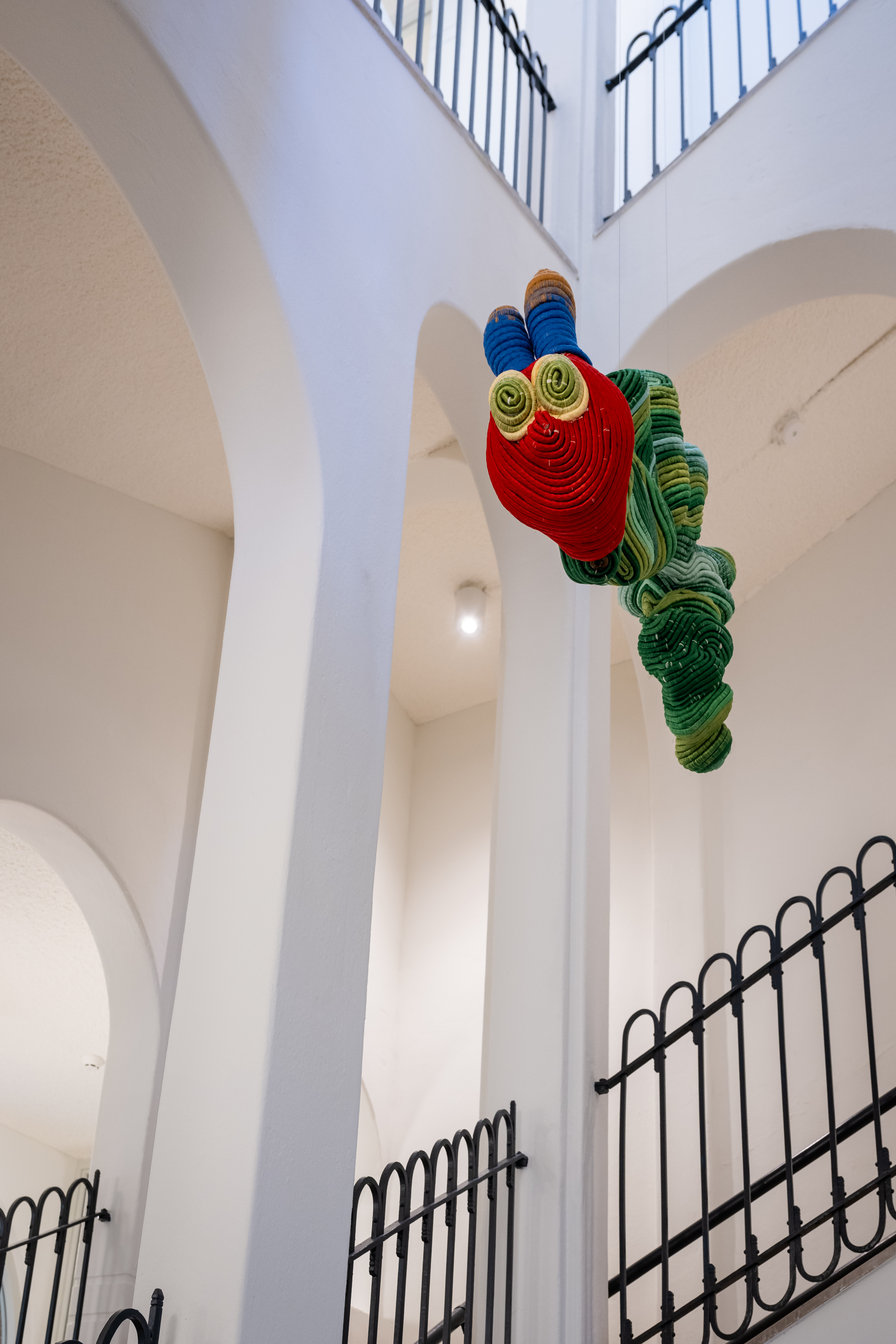 Joana Schneider is a textile artist. During her Textiles study at the Royal Academy of Art in The Hague she developed her passion for textile techniques - especially knotting techniques from fishing. As a student she had a temporary studio in the building of the Toermalijn Community School. With the present commission she has returned to this location. The more than life-size rope works that Joana was working on at the time had captured the attention of the school’s art committee, and they invited the artist to make a monumental textile work for the school. Her playful use of unusual materials - discarded ropes and viscose threads made from recycled plastic bottles - is beautifully expressed in the Toermalijn in the form of a colorful butterfly in the entrance hall. It is a butterfly that spreads its wings over the children’s heads as a protector and a symbol of their transition and development.