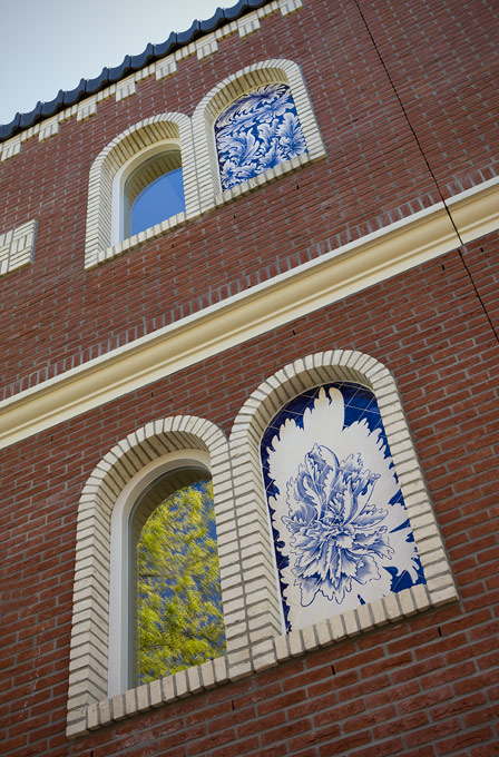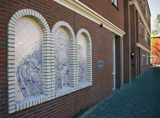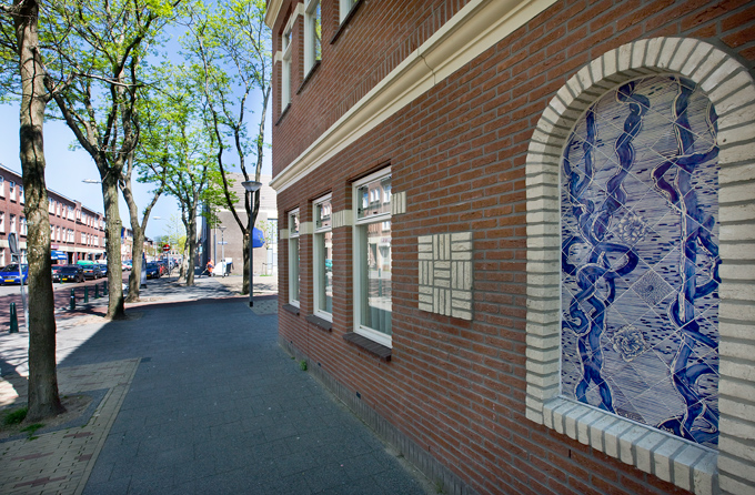 José den Hartog made a special art application of tile tableaux on three facades of the new building of Islamic elementary school Yunus Emre. The architect of the new building had reserved a large number of 'niches' for tile work. José den Hartog has given this an idiosyncratic interpretation; her drawings on the ceramic tiles - mainly blue glass acid drawings on white tiles with some yellow accents - create a dreamy image. In some places you seem to enter an exotic garden; other tableaux depict more abstract motifs.
