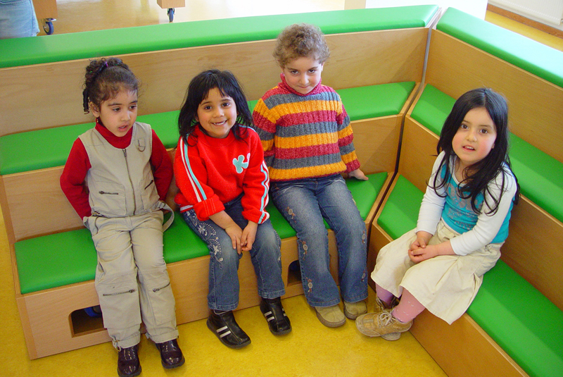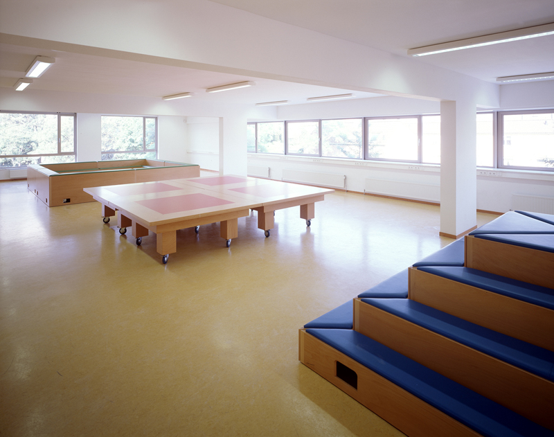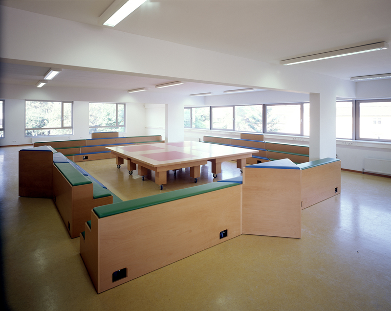 The new building for Prinsehaghe Elementary School, designed by Geurst & Schulze architects, contains a central, multifunctional space annex media library.Marieke van Diemen's design for that space consists of an object that is intended to act as a focus for the school in a figurative sense but is also usable in a literal sense. It consists of three parts - a pyramid, arena and table/podium - which in turn consist of several independently movable and moveable parts. Because of this mobility, the space can be arranged and used as desired. The work was completed on March 17, 2005.