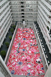 In the summer of 2002, a spectacular painted floral floor was installed in the Atrium of The Hague City Hall by Taiwanese artist Michael Lin. The artwork had the gigantic size of 1100 m2 and was constructed from no less than 370 hand-painted wooden panels. The bright red floor with its colorful motifs inspired by traditional Asian floral patterns contrasted beautifully with the clean, white architecture of the Richard Meier-designed building.