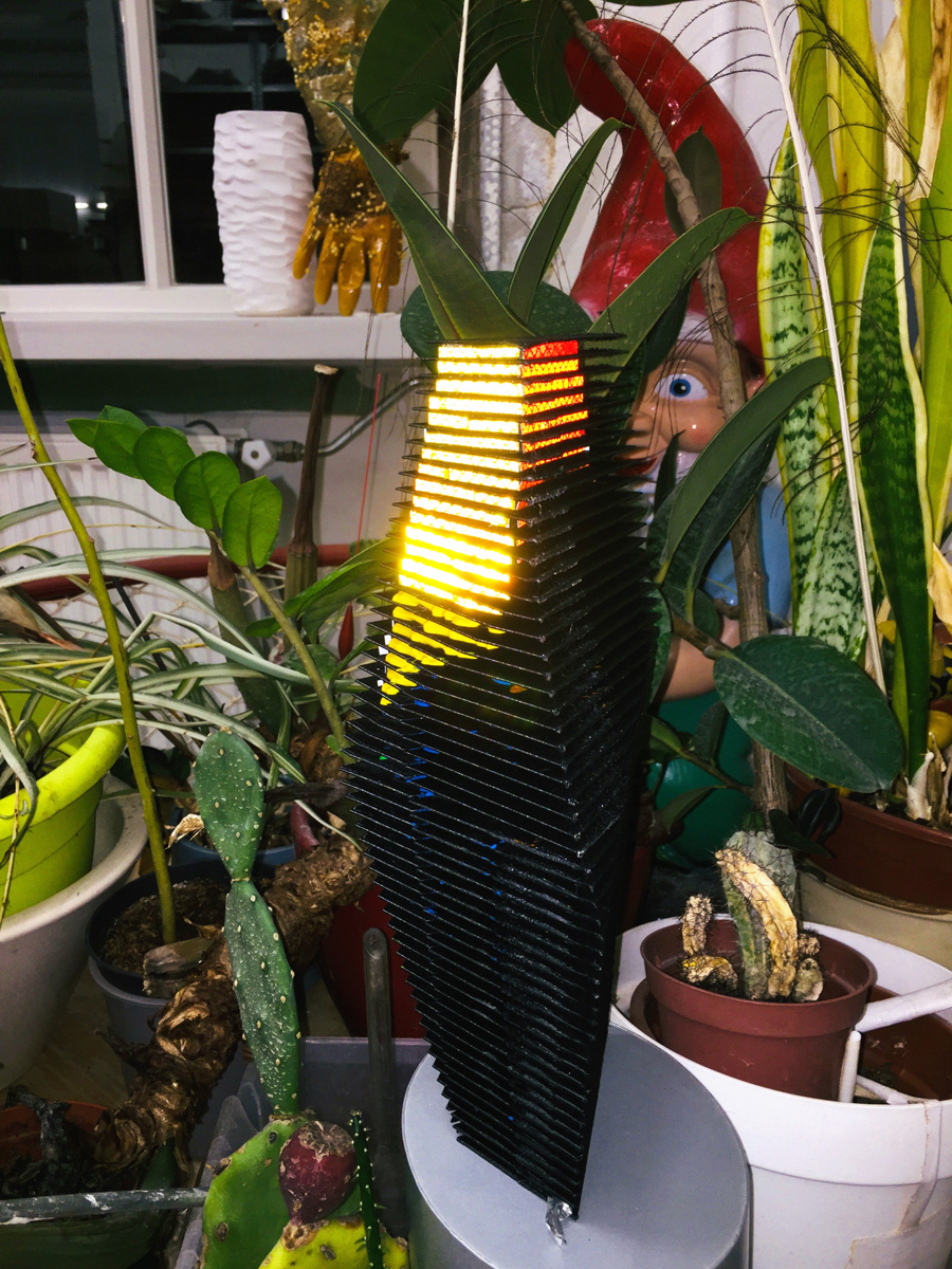 RE/FLECT/OR is a sculpture reminiscent of a building, with horizontal layers alternating with layers of colorful reflectors, creating a completely different effect during the day and night. At night, the effect is particularly intense: the reflectors light up from the glow of traffic and surrounding shop windows, and the color patterns change with movement.