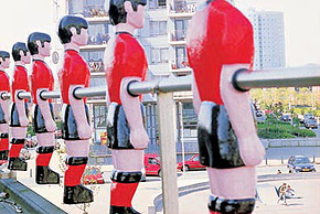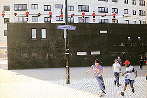 The public elementary school Het Galjoen, built by architectural firm Mecano, was the first school to benefit from the special arrangement that Art and Business carried out for the Mondriaan Foundation. Because every meter inside the school was used for educational purposes, artist Olaf Mooij found opportunities outside. He designed part of a foosball table that was placed in enlarged form on the eaves of the gymnasium. The human-height puppets can move by wind power. A corresponding ball hangs in a lantern pole in the playground. The work was unveiled in 1999 by the then Alderman of Education of the Municipality of The Hague.
