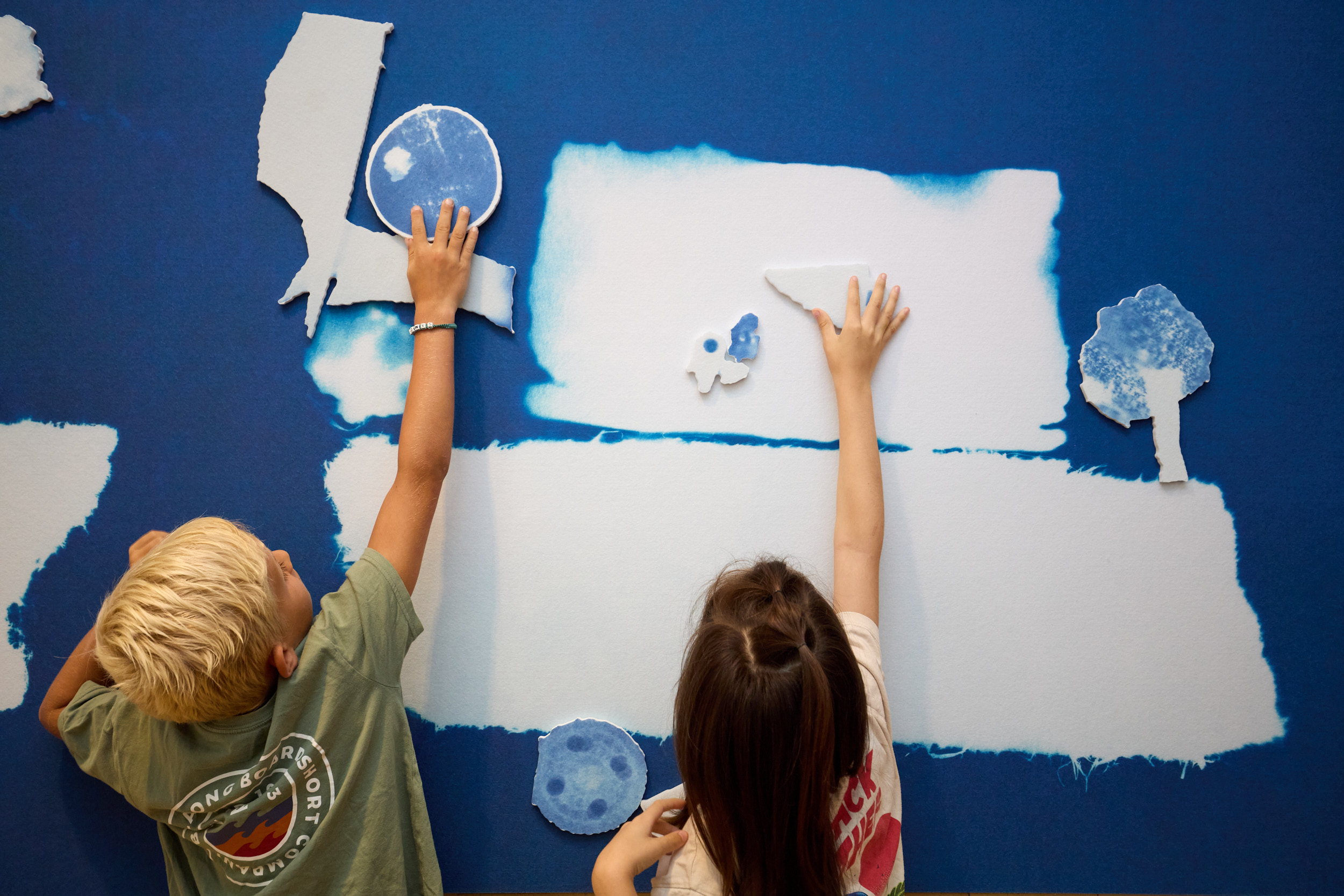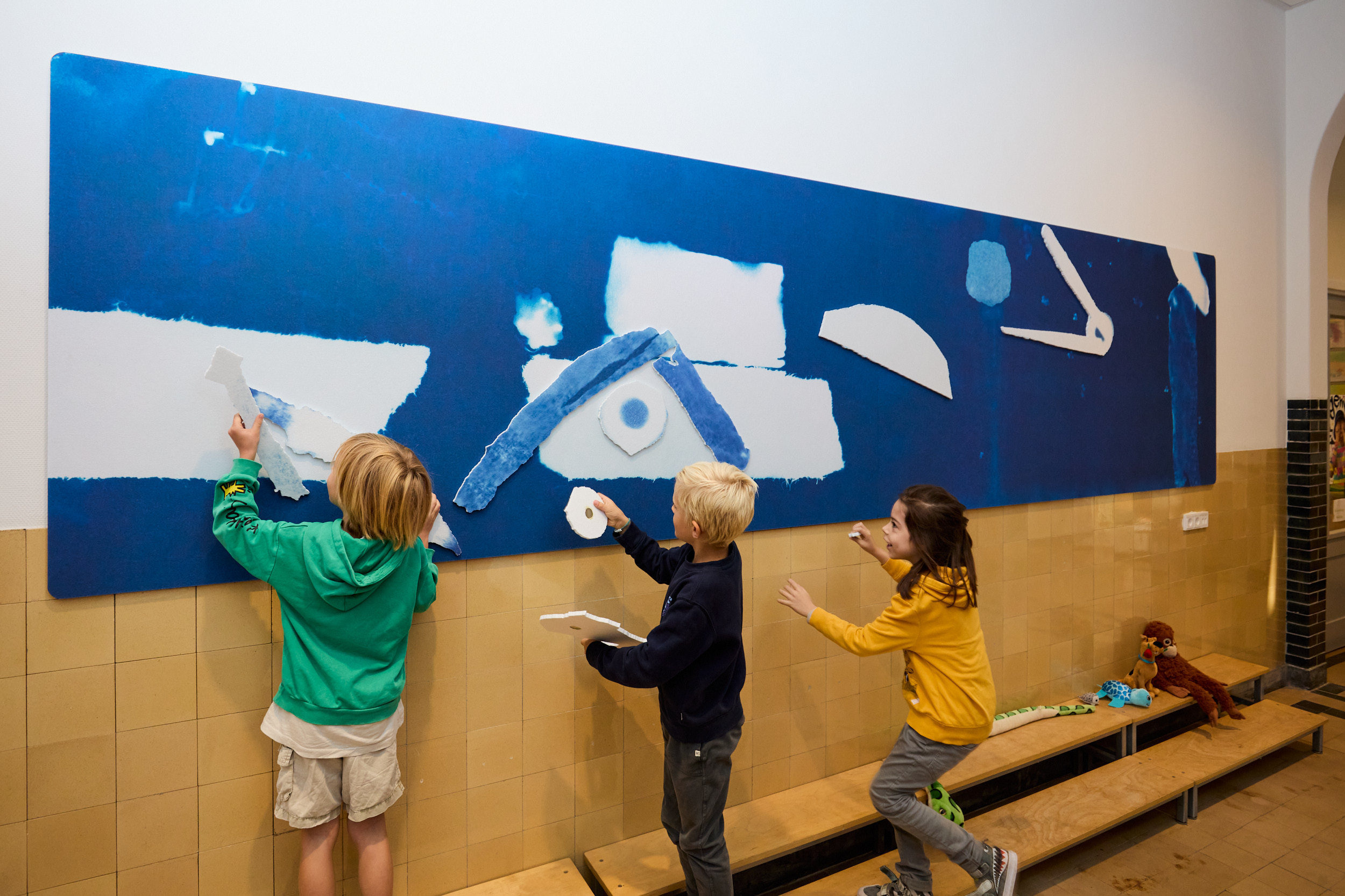 In her project for the Galvani School, Sarah started out by looking for traces near the school and in the school itself. These finds led to a workshop with the students and were incorporated into cyanotypes. This blueprinting is an old-fashioned process and can be compared to modern-day photocopies. The final work is based on these prints.