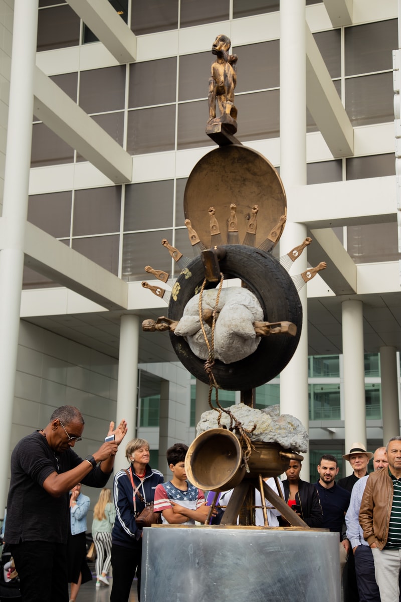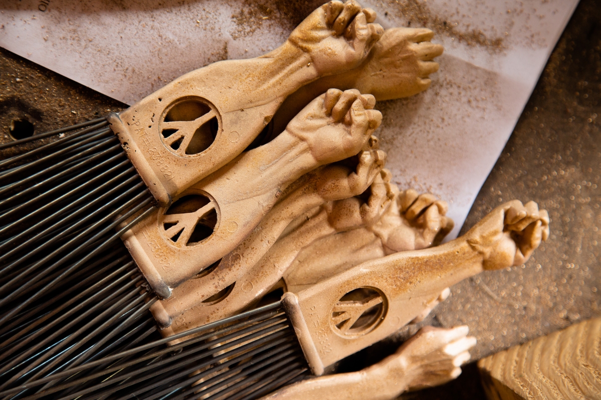The sculpture is largely cast in bronze with a few components of concrete and rubber. In het werk spelen alledaagse objecten de hoofdrol. In his sculptural work, everyday objects play a prominent role. By taking these objects out of their usual context, the artist invites the viewer to rediscover their true meaning. Martha's use of objects such as a barbecue, Afro combs and a piss pot encourage us to come up with hidden associations.