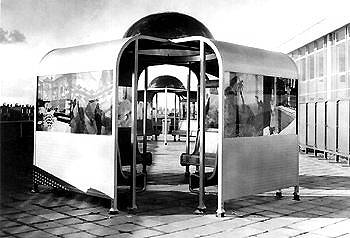 The open roof terrace of the annex of the Johan de Witt College (Hooftskade), where 450 students of over 30 nationalities follow vocational training, is the only place where the students can go outside during class periods. Wijnanda Deroo designed four pavilions constructed of steel with red and blue skylights. The walls above the benches consist of transparent photomontages.