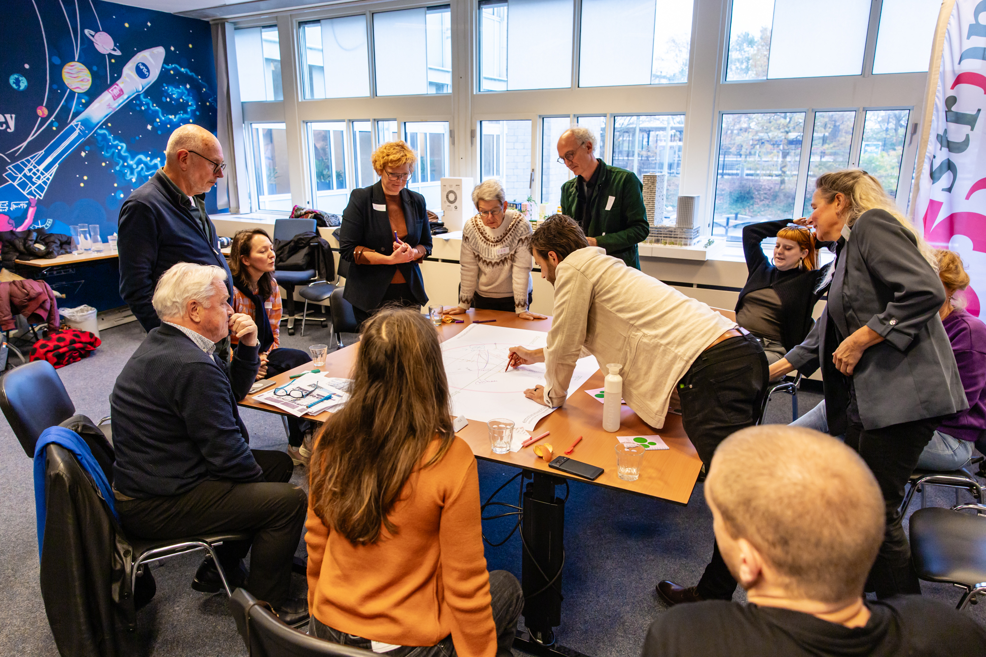 Verschillende stakeholders waaronder de kunstenaar, vertegenwoordigers uit de buurt en van de gemeente, en Atelier Rijksbouwmeester gaan met elkaar in gesprek.