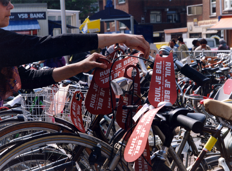 Knight did not want a static work, but active participation by the public. Referring to the stork in The Hague’s coat of arms, he proposed the production of thousands of bicycle bells that croaked like frogs. He then staged an advertising campaign on city buses and in bicycle parking areas calling on residents to exchange their Dutch bicycle bells at Stroom, intending to ship them to Cuba as a way of circumventing the embargo through an art route.