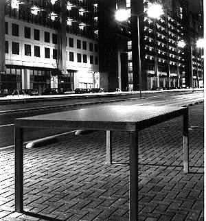 Opposite Aldo Rossi’s massive housing complex, along a busy road and by the water, stood a large rectangular stainless steel table with on either side of its surface the words Protection and Emptiness. Van Isacker: “Its beauty does not lie in the object itself, but in the thoughts it evokes when looked at.”