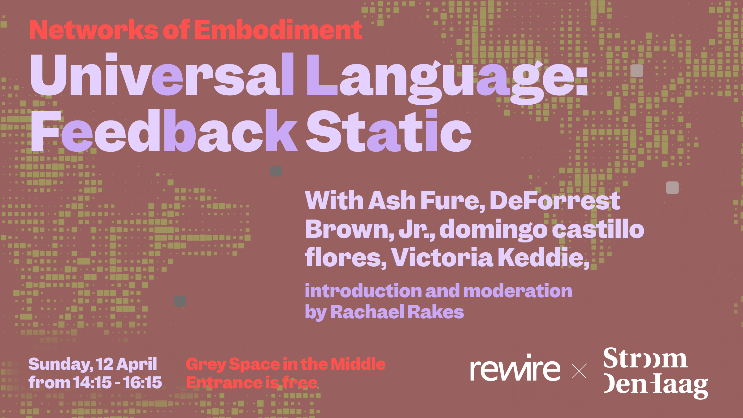 A collaboration between Rewire and Stroom Den Haag, the event follows the programme trajectory Universal Language, which researches and remodels digital computation’s history, social life, and its many alternate models through art, science, and poetics. Guest curated by Rachael Rakes, Universal Language is conceived as a part of Stroom Den Haag’s multi-year initiative Networks of Embodiment, which explores how the body, ecology, and technology co-shape new forms of collective life.