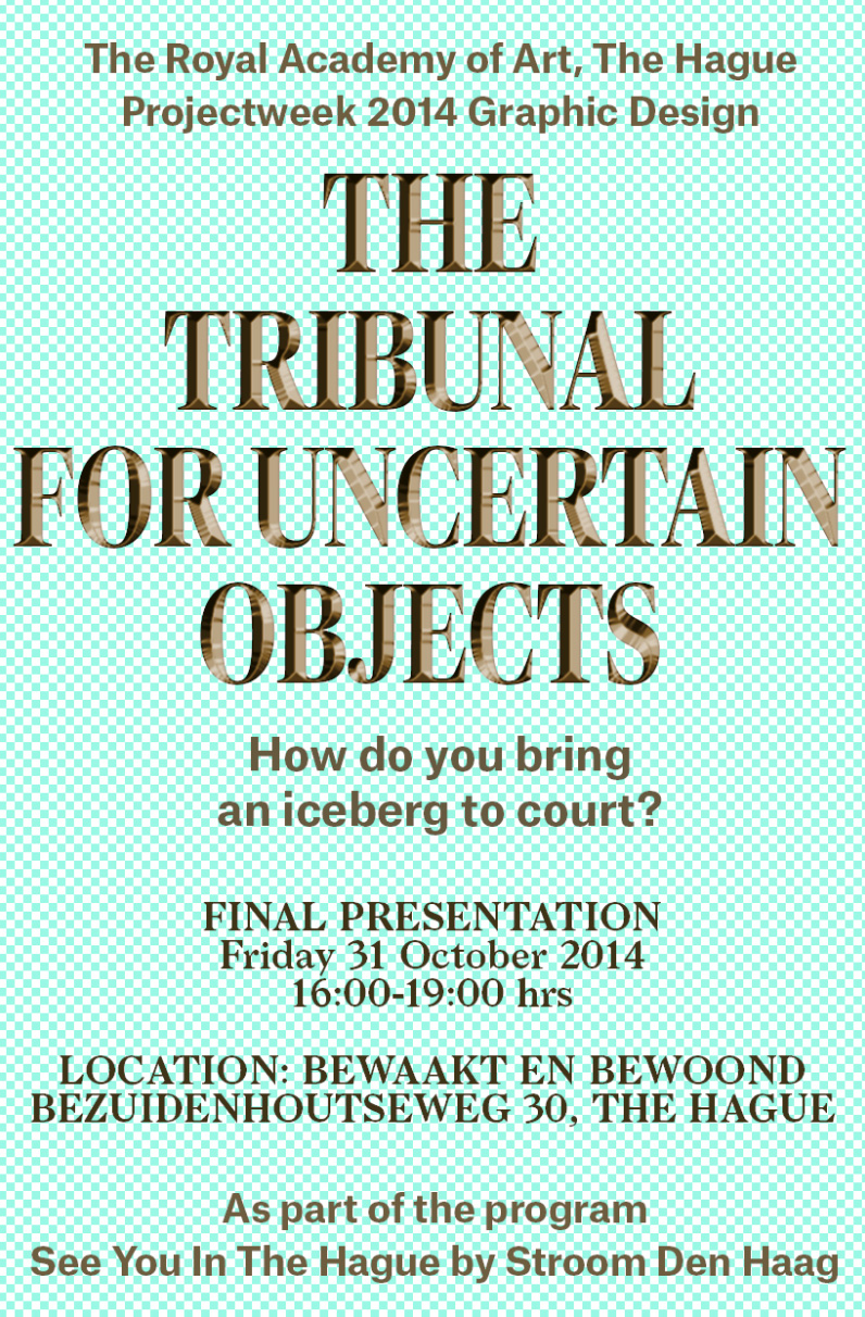Every year the Royal Academy of Art The Hague (KABK) and Stroom Den Haag organize a project week under the title On Responsibility. This year's objective was to answer the question "How do you bring an iceberg to court?" The week was organized in collaboration with Susan Schuppli and part of the program See You in The Hague. This mini-exhibition was the award-winning entry of a group of graphic design students (from all four years) who discussed the insignificance of a signature.