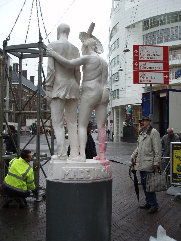homestroom den haagprogrammakunst en de stedelijke omgevingsubsidies, documentatie en atelierskenniscentrumPublicatieseducatiepers archiefzoekenglish Anno Dijkstra, ‘A Last Farewell’, 2011 Centrum Den Haag: Spui - Grote Marktstraat - Kalvermarkt Een vakantiekiekje. Daar lijkt het sokkelbeeld van Anno Dijkstra (1970) nog het meeste op. Een inheemse bewoner van het Amazone-gebied in vol ornaat omarmt voor de foto een willekeurige westerse toerist. Het blijkt wel een kiekje met een scherp randje. Want waarom heeft de man geen rechterarm? En hoe komt het dat het witte beeld hier en daar gerepareerd lijkt te zijn in een andere kleur? Het praktische antwoord is dat die arm niet paste binnen de strakke afmetingen die voor elk sokkelbeeld gelden. Belangrijker zijn echter andere associaties die door de amputatie ontstaan. Samen met de reparaties roept het direct herinneringen op aan beelden van de oude Grieken en Romeinen. Tegelijkertijd verwijst het naar het feit dat de oorspronkelijke Amazone-cultuur voor haar voortbestaan tegenwoordig grotendeels afhankelijk is van toerisme. Omgekeerd heeft de westerse toerist behoefte aan het consumeren van authentieke culturen. Zeker in de drukke winkelstraten waar het sokkelbeeld staat, roept dat de vraag op: wie is er nu eigenlijk afhankelijk van wie? Veel van Dijkstra's werk gaat over beelden die krant en televisie dagelijks over ons uitstorten. Denk aan het napalmmeisje uit Vietnam, de paddenstoelwolk van de atoombom of de vermoorde Theo van Gogh. Deze vaak schokkende beelden staan in ons collectieve geheugen gegrift. Door van zulke iconische beelden hyperrealistische sculpturen te maken en ze op een bijzondere manier te presenteren, zet Dijkstra je aan het denken over wat die beelden eigenlijk laten zien en vooral ook hoe. Zo confronteert de kunstenaar de beschouwer niet alleen met zijn eigen reactie, maar ook met vragen over het gebruik van beelden in de media. In 2008 bijvoorbeeld plaatste Dijkstra tijdens de tentoonstelling Madrid Abierto een sculptuur van een ondervoed kindje op een boulevard in de Spaanse hoofdstad. Voorbijgangers sloegen het beeld een lap stof om, aaiden het of gingen ermee op de foto. Die uiteenlopende reacties zijn in een publicatie vastgelegd. www.annodijkstra.nl Meer over de Beeldengalerij: klik hier. PERS Den Haag Centraal, 23 december 2011 21 Dec '11 Anno Dijkstra, ‘A Last Farewell', 2011 foto: Sander Foederer, courtesy Stroom Den Haag Anno Dijkstra, ‘A Last Farewell', 2011 foto: Stroom Den Haag Anno Dijkstra, ‘A Last Farewell', 2011 foto: Stroom Den Haag Anno Dijkstra, ‘A Last Farewell', 2011 foto: Stroom Den Haag Anno Dijkstra, ‘A Last Farewell', 2011 foto: Stroom Den Haag