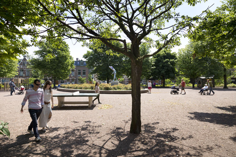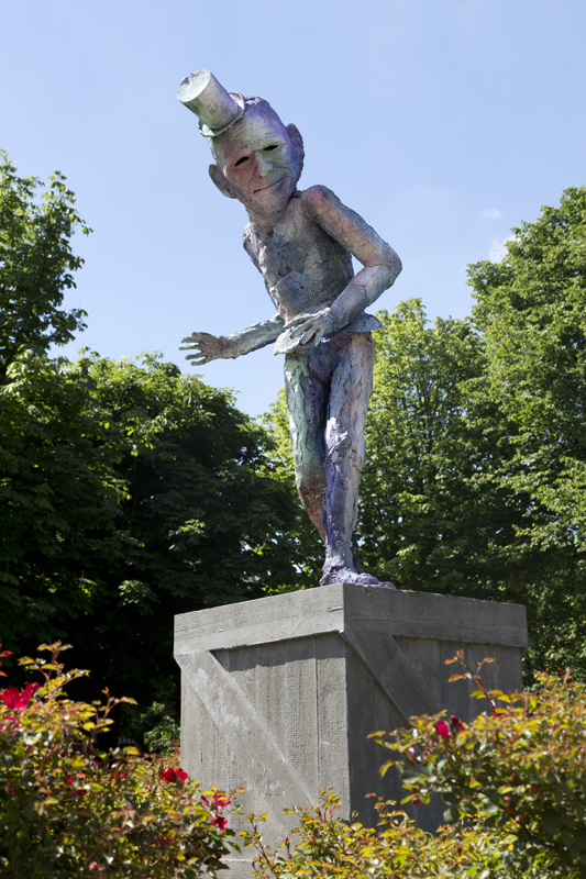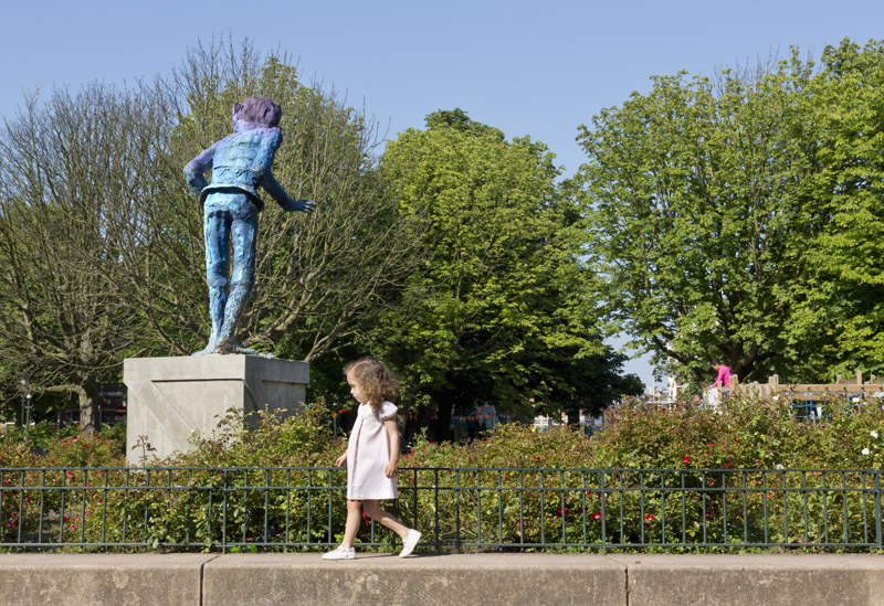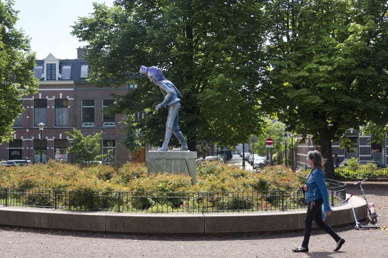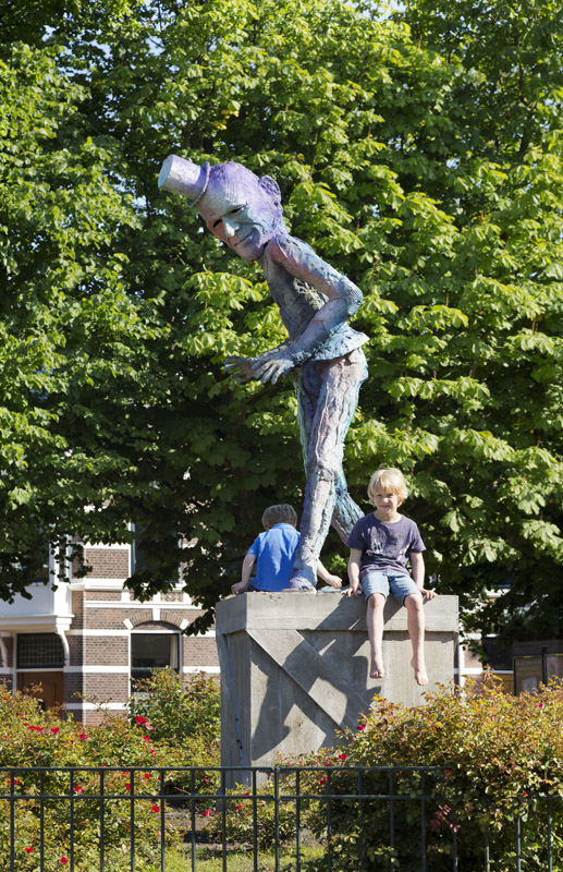 homestroom den haagprogrammakunst en de stedelijke omgevingsubsidies, documentatie en atelierskenniscentrumPublicatieseducatiepers archiefzoekenglish Folkert de Jong ‘De Speler’ Koningsplein, Den Haag Locatie: Koningsplein, Den Haag Onthulling: zaterdag 21 juni 2014, 14 uur door wethouder Ingrid van Engelshoven, gevolgd door een feestelijke middag met kinderspelen Fotoalbum van de onthulling Op zaterdag 21 juni 2014 werd het beeld De Speler van kunstenaar Folkert de Jong op het Koningsplein in Den Haag onthuld door Ingrid van Engelshoven (wethouder Onderwijs en Dienstverlening). Gedurende de feestelijke middag organiseerde het bewonerscomité op het plein tal van kinderspelen. Na het jarenlang pleidooi van omwonenden krijgt het Koningsplein eindelijk weer een markant kunstwerk. Spelende kinderen en ouders op bankjes zijn het nieuwe publiek van de nar van het Koningsplein. Ooit de locatie van Horse Power, een parodie op een klassiek ruiterstandbeeld van de Israëlische kunstenaar Zadok Ben-David, stond er nu al jarenlang slechts een lege sokkel op het Koningsplein. Omwonenden wilden graag weer een nieuw kunstwerk. Men wilde een kunstenaar die het Koningsplein kon 'verbijzonderen', iemand die de identiteit van de buurt (zelf samengevat als ‘allure vs kneuterigheid') in een aansprekend beeld wist te vatten passend ook bij het karakter van het plein. Een delegatie - geformeerd in een kunstcommissie - koos er onder begeleiding van Stroom Den Haag uiteindelijk voor, om Folkert de Jong een nieuw beeld te laten maken. In de beelden van Folkert de Jong figureren historische figuren in soms groteske taferelen. Door het gebruik van kleurige maar kwetsbare kunststoffen waren zijn beelden niet eerder permanent in de openbare ruimte te zien. Het beeld voor het Koningsplein, en het werken met meer klassieke materialen zoals brons, was voor de kunstenaar dan ook een uitdaging. De hofnar en diens ambivalente verhouding tot het hof vormde de inspiratiebron voor De Speler; de hofnar mag de koning bespotten maar is tegelijk afhankelijk van hem als werkgever. Om de trekken van De Speler naar het nu te halen keek de kunstenaar naar de koppen van acteurs als Willem Dafoe en Klaus Kinski. Het beeld neemt met z'n verstilde houding - als in het oog van de storm - een centrale plek in op het drukke plein, waar het zowel koning als nar kan spelen. www.folkertdejong.org PERS Konkreetnieuws, februari 2019 Den Haag Centraal, 27 juni 2014 KonKreet (wijkkrant Regentes/Valkenbos), juni 2014 if then is now, 28 mei 2014 21 Jun '14 Folkert de Jong, 'De Speler' foto: Gerrit Schreurs, courtesy Stroom Den Haag Folkert de Jong, 'De Speler' foto: Gerrit Schreurs, courtesy Stroom Den Haag Onthulling 'De Speler' op 21 juni 2014 foto: Eric de Vries, courtesy Stroom Den Haag