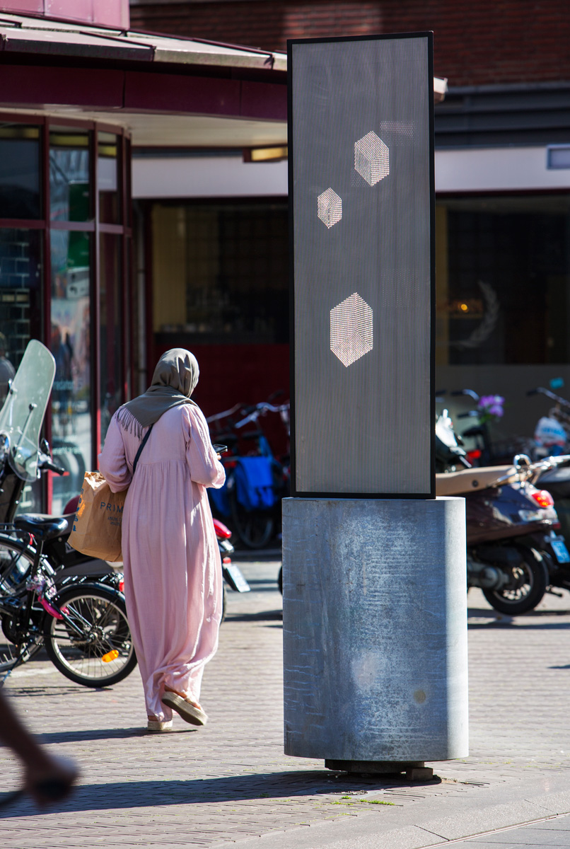 Het beeld Bambaataa van Gabriel Lester is een grote zwartmetalen sculptuur, een driehoekige vorm, met daarin drie kubusvormen van lichtgrijs gaasmetaal. Aan één kant toont het een maskerachtig gezicht, waarvan de ogen en de mond zonlicht doorlaten. Hierdoor ontstaan er aan de andere kant holografische projecties van geometrische vormen. Hoewel het een sculptuur is, heeft het, in lijn met het oeuvre van Lester, een fotografisch en filmisch karakter: de verschijningsvorm zal steeds anders zijn al naar gelang de lichtsituatie en het standpunt van de kijker. Het beeld komt aan de Grote Marktstraat te staan, precies op het zuidoosten - als de zon zakt dan staat ze, als een spotlight, pal op het beeld.