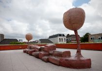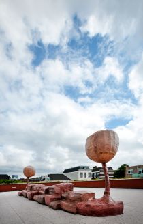 Nacho Carbonell heeft voor het Johan de Witt College in de Capadosestraat een reusachtig ‘bench' gemaakt. Op het dak van de school liggen de vleeskleurige kussen als in een huiskamer te wachten op de leerlingen. Als het donker wordt, werpen twee reusachtige maanvormige bollen licht over het plein en kijk je prachtig uit over de Haagse skyline.