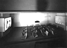 Ter gelegenheid van de oplevering van Park in het Water bij de Haagse Hogeschool ontwierp Acconci samen met de medewerkers van zijn Studio een speciale installatie om zijn videotapes en films-op-video te laten zien. Aan de kolommen in de zaal werden zwartgeschilderde ‘headtheatres' bevestigd. Als men de tapes wilde bekijken kon men op de op staven gemonteerde fietszadels gaan zitten. In de benedenruimte was een filmzaaltje ingericht met houten ‘zitten', om en om gearrangeerd, zodat men frontaal tegenover iemand gezeten de film kon bekijken, terwijl naast je de buurman de tegenovergestelde kant op zat te kijken. Het bijzondere en daarom nog steeds inspirerende is dat Acconci de video niet gebruikt om te documenteren, maar dat hij de kijker rechtstreeks deelgenoot maakt van zijn confidenties en agressies. Hij hanteert de monitor als een raam naar buiten en maakt zo zijn hoogstpersoonlijke overwegingen publiek. Vooral jongere kunstenaars nu, die in hun werk het lichamelijke accentueren, kregen hiermee de gelegenheid kennis te maken met Acconci's onderzoek in de jaren zestig en zeventig waarin hij de relatie tussen de ‘ik', de ‘ander' en de tussenliggende ruimte centraal stelde. Op de glazen deur en ruit van de entree van de tentoonstellingsruimte werd de video ‘Fresh Acconci' van Paul McCarthy en Mike Kelley groot geprojecteerd. Het is een eigentijdse remake van enkele video's van Acconci.