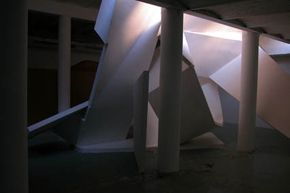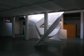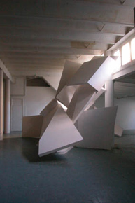 André Kruysen is beeldhouwer. Hij bouwt architectonische structuren en wel op zo'n manier dat het binnenvallende daglicht daarmee een vorm krijgt. In de tentoonstellingsruimte van Stroom aan de Toussaintkade bouwde hij de installatie 'Over Vedra', die bestond uit twee monumentale beelden die beurtelings het licht geleiden en het duister omhullen.