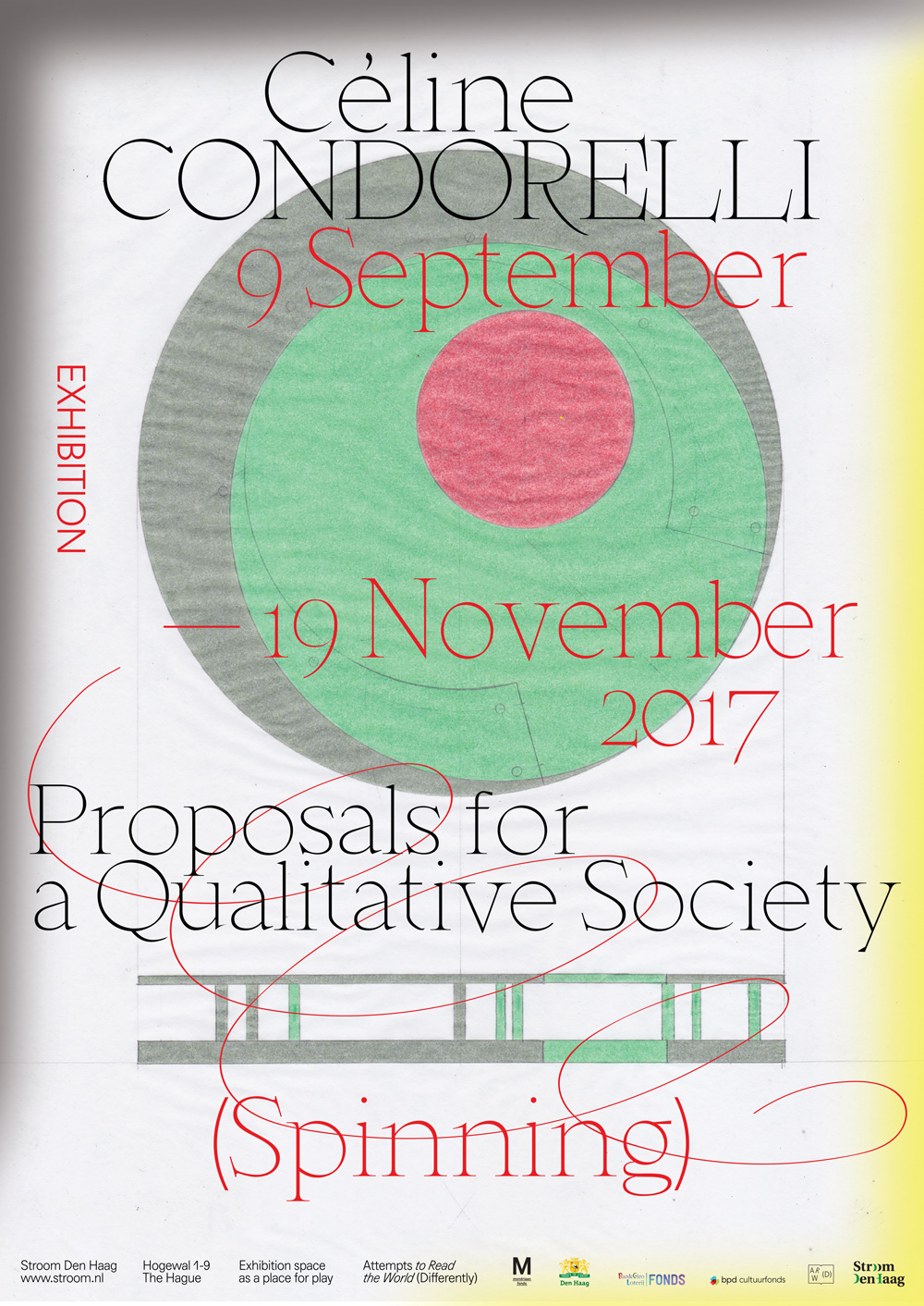 Met Proposals for a Qualitative Society (Spinning) presenteert Céline Condorelli de tentoonstellingsruimte van Stroom als een plek voor oefening en spel: carrousels en tollen nodigen de bezoekers daartoe uit, terwijl (historische) referenties van radicale speeltuinontwerpen het belang tonen van een cultuur van spelen voor stad en samenleving.