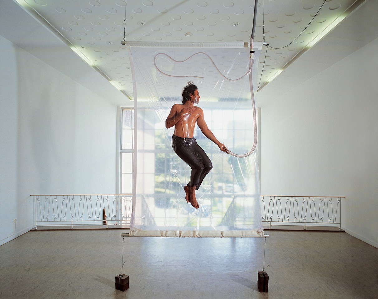 Twee grote, doorzichtige plastic vellen en een apparaat dat de lucht er geleidelijk uit zuigt, verlaten het lichaam (in dit geval de kunstenaar zelf) vacuüm verpakt en verticaal opgehangen. Door de transparante buis tussen de twee oppervlakken kan de persoon in de installatie de luchtstroom regelen. Als gevolg van de toenemende druk tussen de plastic vellen, bevriest het oppervlak van het verpakte lichaam geleidelijk in meerdere microvouwen. Gedurende de performance beweegt de persoon binnenin langzaam en verandert van positie, die varieert van een bijna embryonale positie tot een die lijkt op een gekruisigd lichaam.