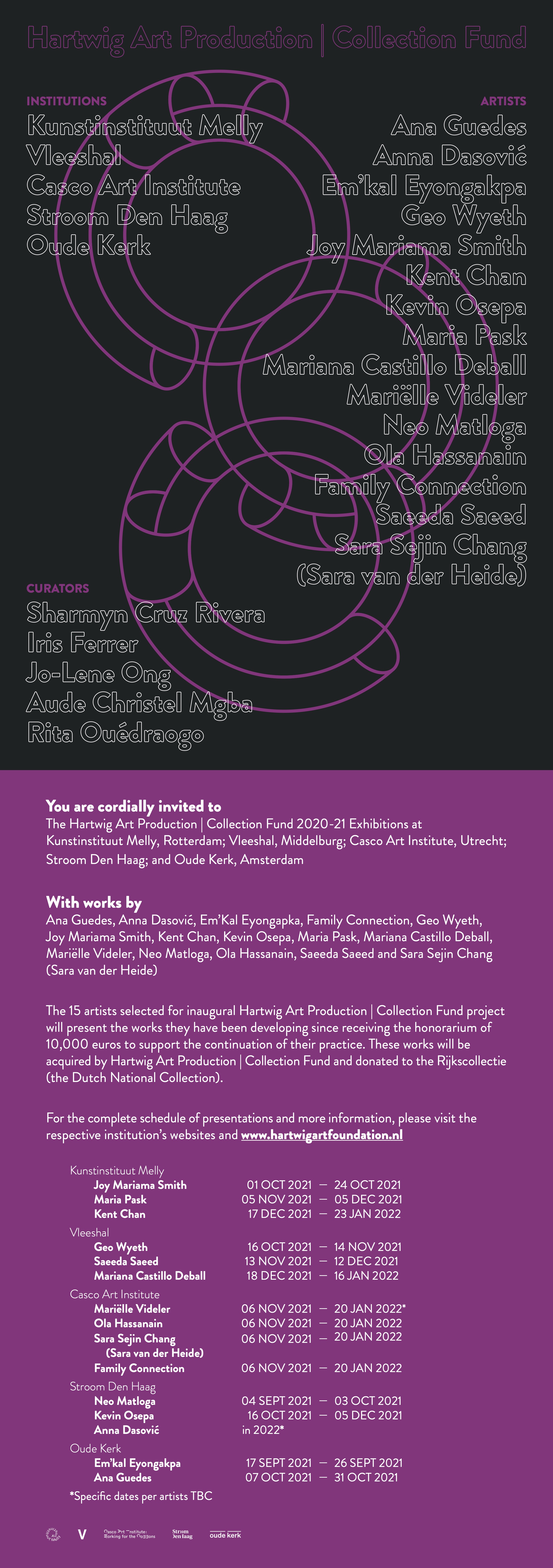 Het Hartwig Art Production | Collection Fund stimuleert experimenten en creativiteit op het hoogste niveau. Jaarlijks ondersteunt het fonds een groep kunstenaars bij het maken van nieuw en ambitieus werk. De kunstwerken worden uiteindelijk door de Hartwig Art Foundation aangekocht en aan de Rijkscollectie (de kunstcollectie van de Nederlandse staat) geschonken. Op die manier levert het fonds een blijvende maatschappelijke bijdrage.Voor het Special Project 2020-2021 zijn samenwerkingen met presentatie-instellingen in Nederland aangegaan. Naast Stroom Den Haag zijn er presentaties van in totaal 15 kunstenaars te zien bij Kunstinstituut Melly (Rotterdam), Oude Kerk (Amsterdam), Vleeshal (Middelburg) en Casco Art Institute (Utrecht).