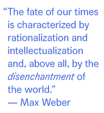 ‘Door de rationalisering en intellectualisering, maar vooral door de onttovering van de wereld, bestaat het lot van onze tijd hierin dat juist de diepste en subliemste waarden uit de openbaarheid zijn verdwenen, en zich hebben teruggetrokken in een onwerelds rijk van mystiek leven of in de broederlijkheid van directe betrekkingen van individuen onder elkaar.'